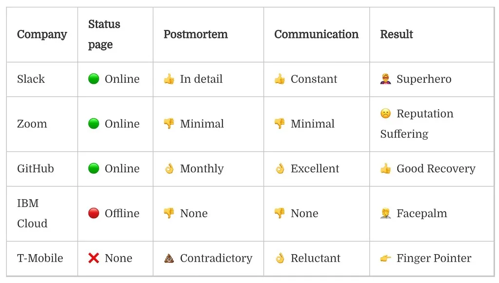 让我们根据这些宕机事件的发现、相关公司的沟通以及每个事件的结果来评定。