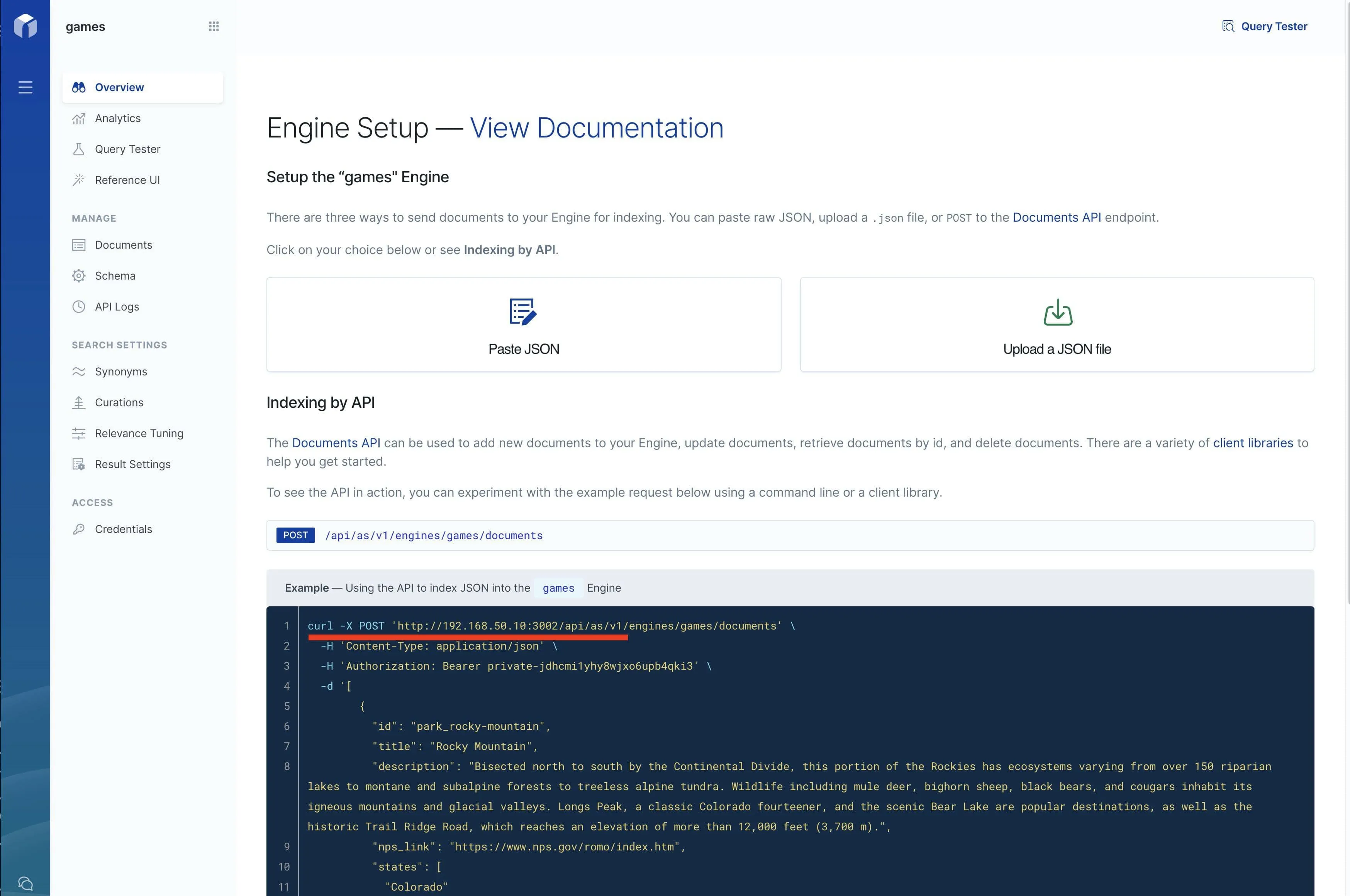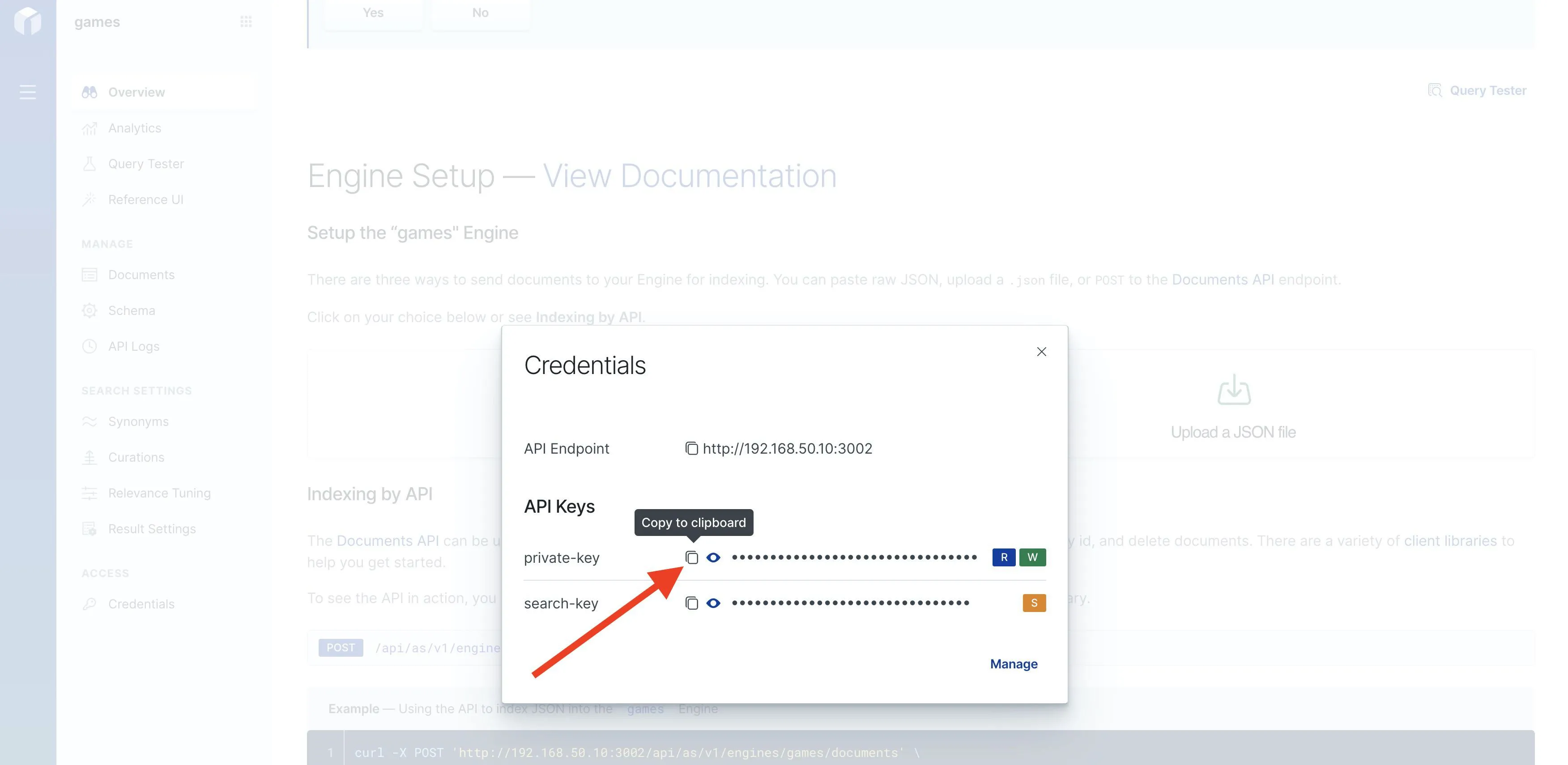 在首页的创建引擎的输入框中输入 games, 语言选择默认选项,点击创建。浏览新创建的引擎,点击左下角的菜单 Credentials,复制 privite-key 备用。