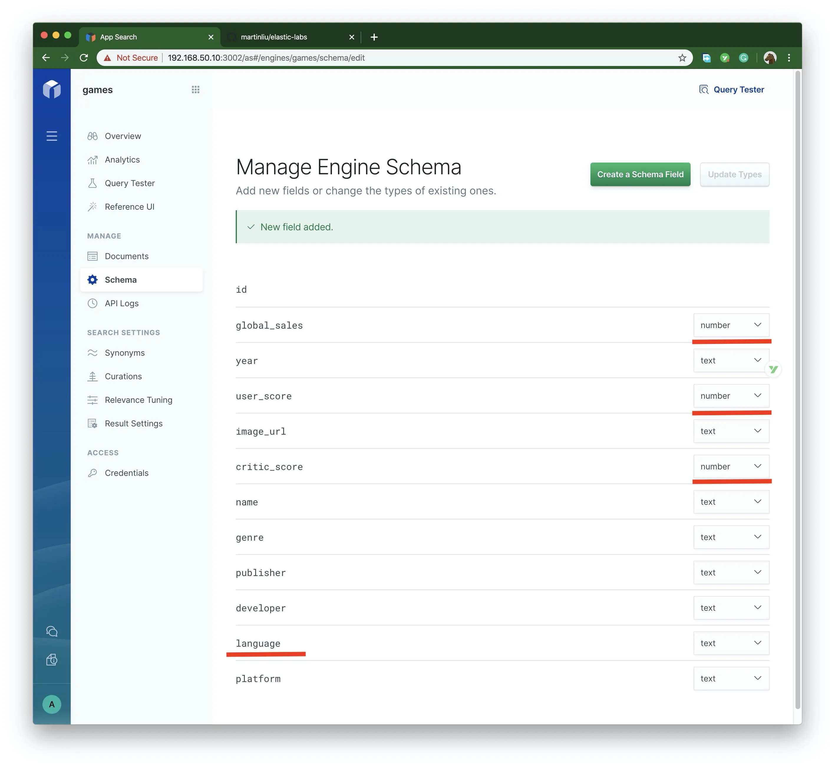 修改三个字段的定义,并增加 language 字段,点击右上角的 Update Type 按钮生效。