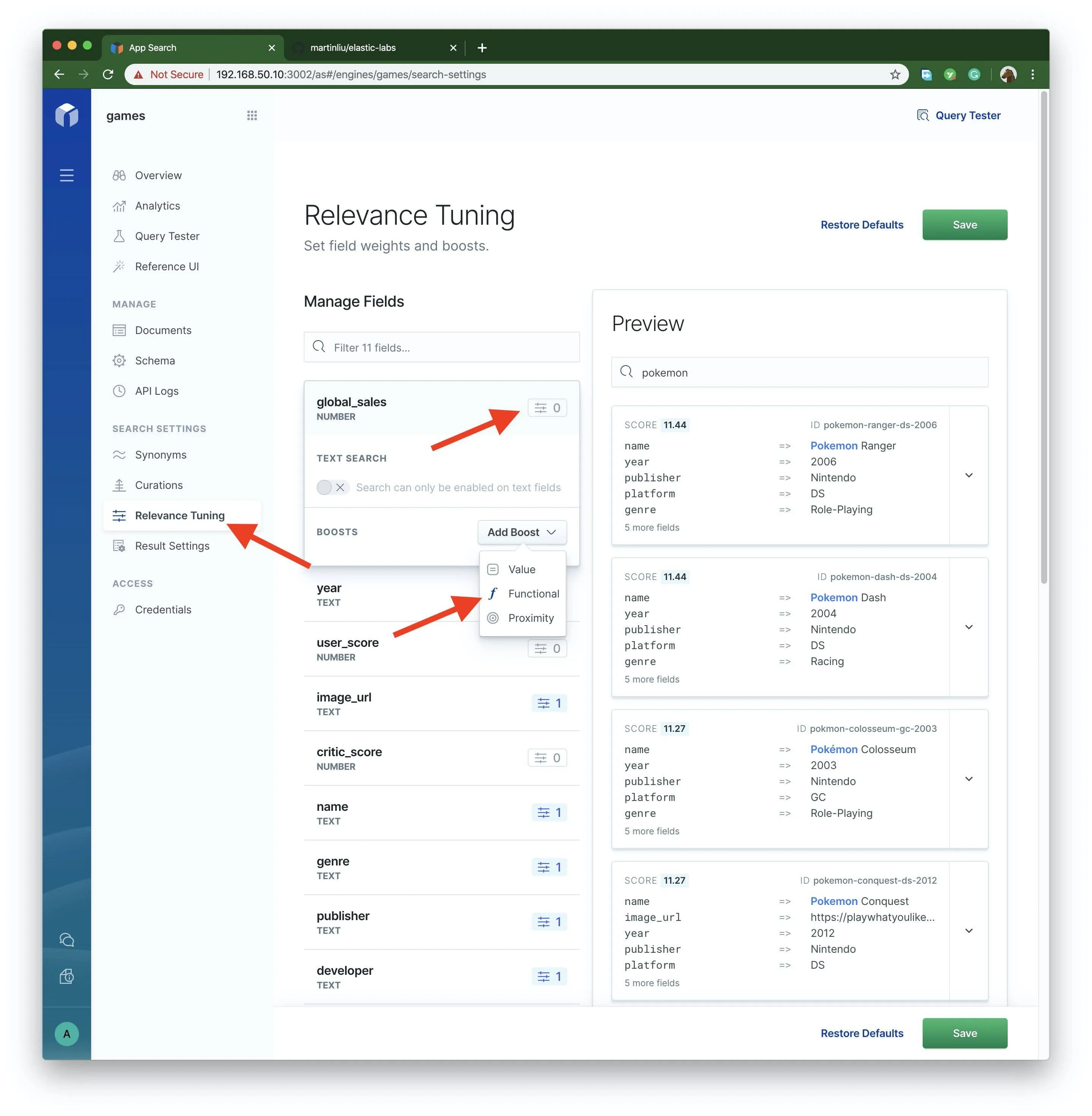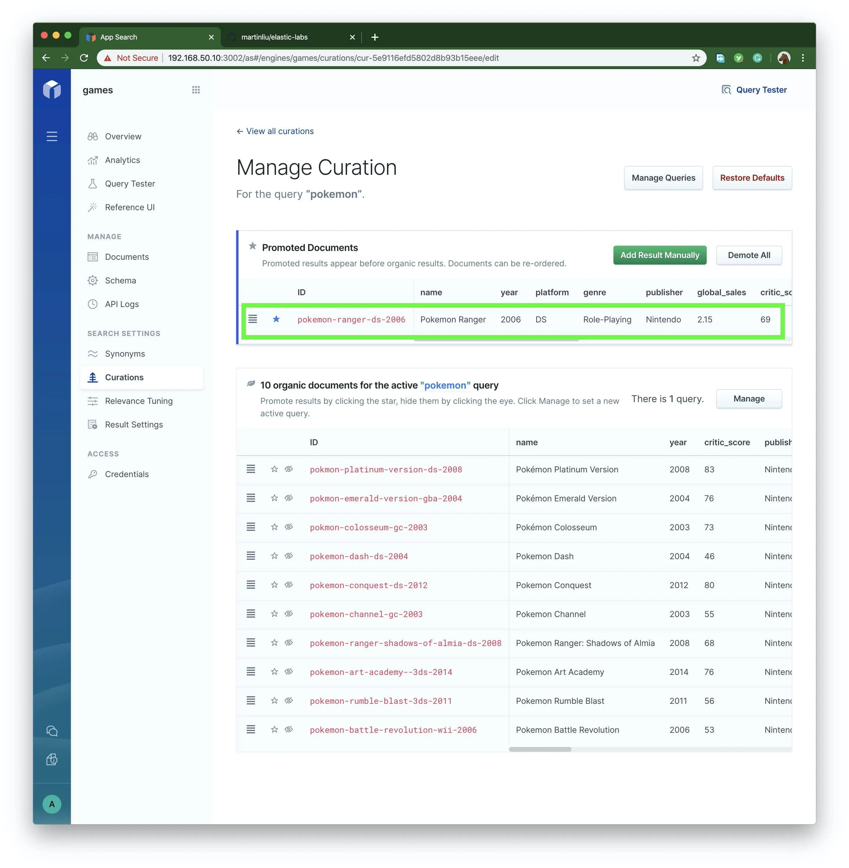 故意将某条搜索结果置顶,这有可能因为,这款游戏目前是热评游戏,是畅销爆款,是高利率商品,是广告商品,或者其他业务原因。可以给某个关键字,置顶一条或者多条搜索结果。下面将 pokemon 的 pokemon-ranger-ds-2006 这款产品置顶。点击右上角的 Query Tester 测试一下效果。