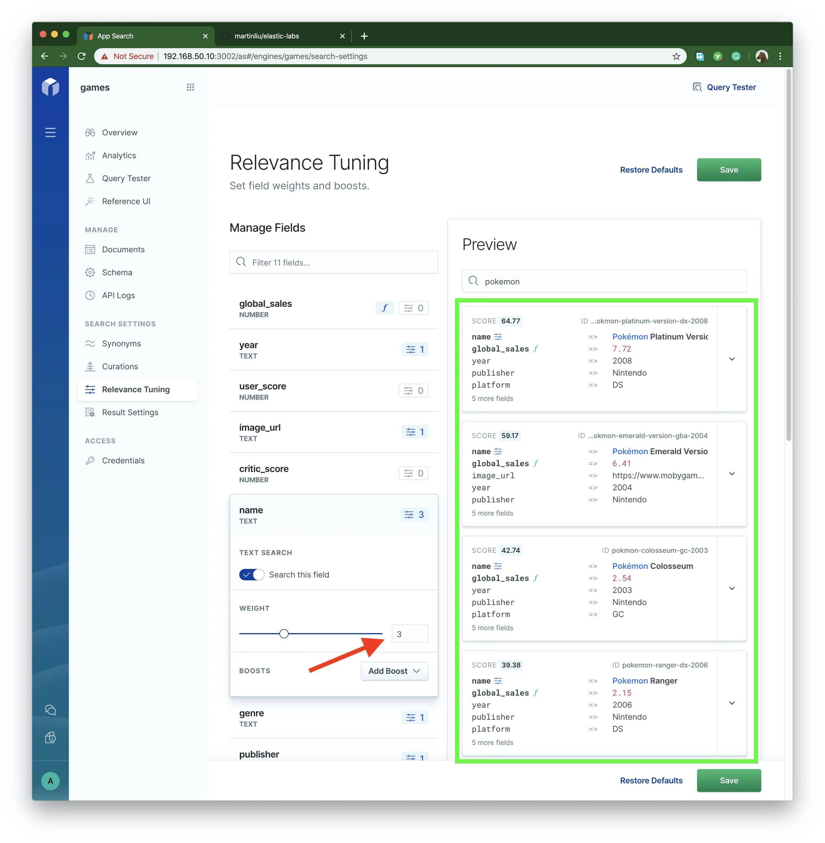 为 Name 增加 weight 3 ,点击右上角的 Save 保存。在这个过程中观察右侧的搜结果的动态变化,还可以做其他字段的修改,知道搜素结果满意为止。
