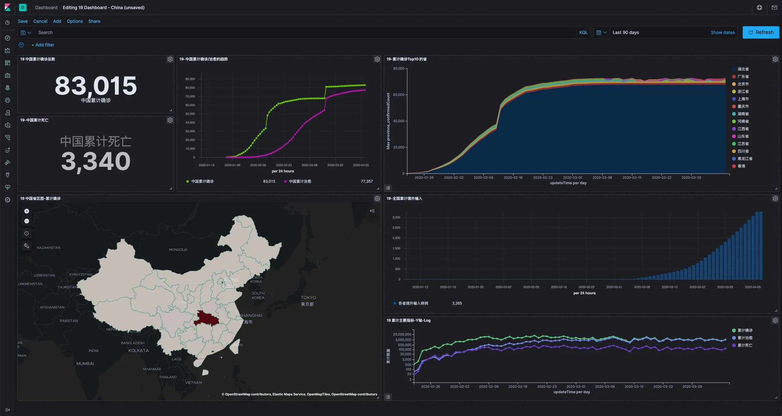 这个仪表板中的地图是亮点,建议仔细学习研究一下。 这个仪表板的来源是一篇国外的文章: https://www.siscale.com/importing-covid-19-data-into-elasticsearch/