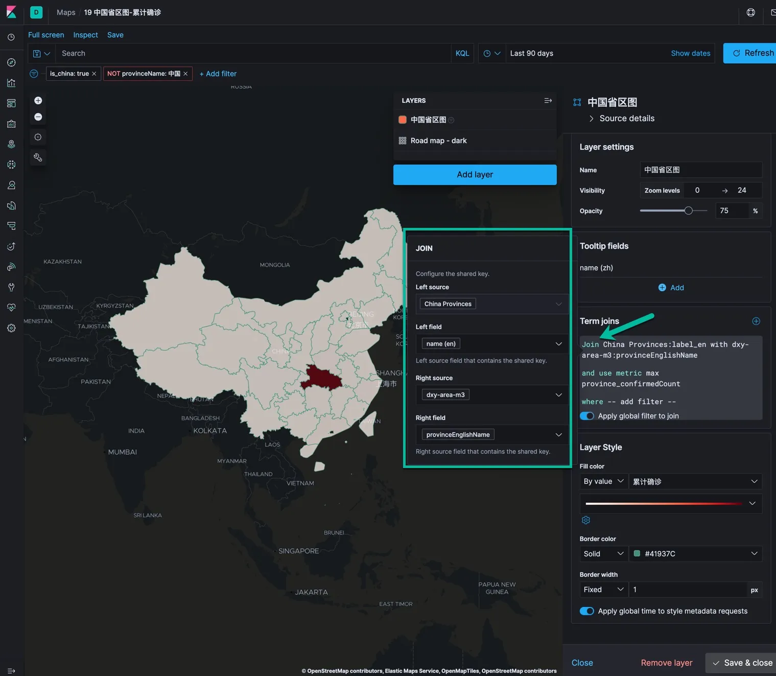 - 设置 Term Joins 的规则,点击 Join 关键字,设置索引中的数据和地图的关联。如下图所示,这就是我们为什么要把导入数据中的省英文名称与 EMS 的定义数据对齐了。
