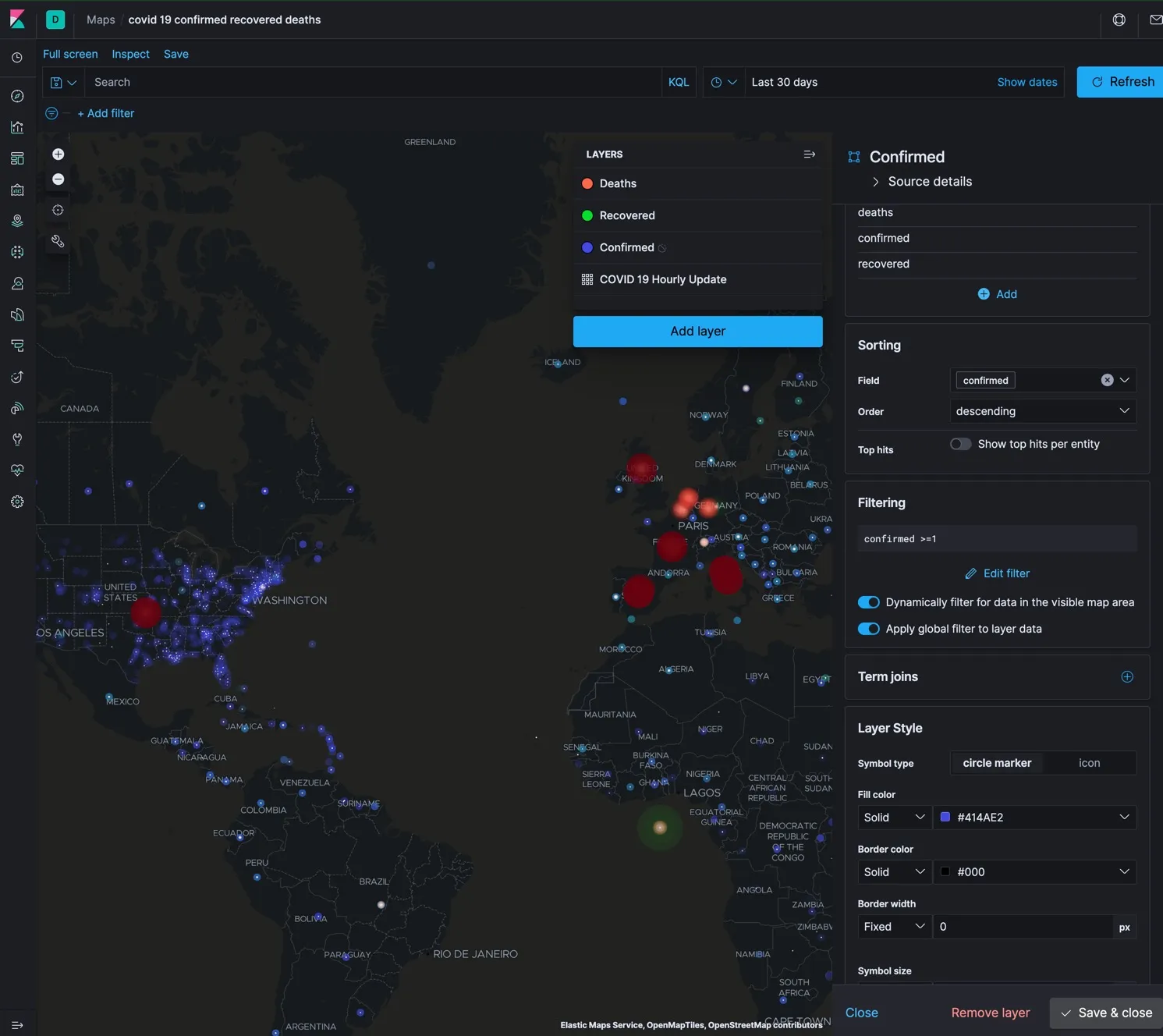 我在一个小时左右,根据经验顺利的在我的实验环境里顺利生成了这个成果。下面是根据这篇文章怎么样使用 logstash 导入 Github 中世卫组织发布的数据,并持续与之保持同步。这里是他们的代码:https://github.com/siscale/covid-19-elk